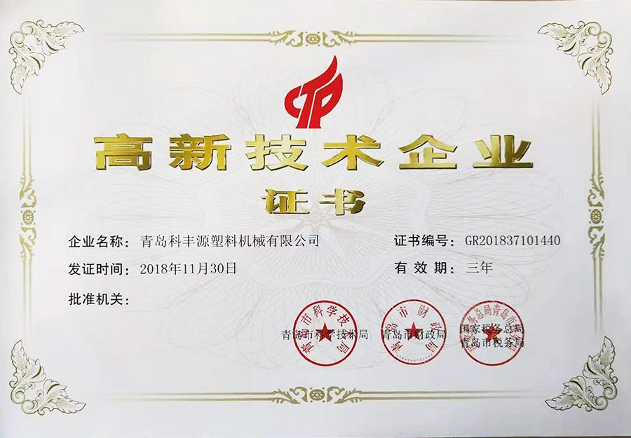 青島科豐源塑料機(jī)械有限公司獲得高新技術(shù)企業(yè)證書